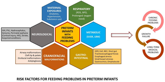 Image text description: Image shows risk factors: Common clinical conditions associated with feeding problems in preterm infants. These can be Neurological (IVH: intraventricular hemorrhage, Hydrocephalus, Seizures, Perinatal asphyxia, Cortical injury, HIE, Stroke or acquired conditions), Craniofacial (Airway malformations, cleft lip and palate, Orofacial malformations, Ankyloglossia), Gastrointestinal (GER: gastroesophageal reflux, EoE: eosinophilic esophagitis, NEC, Short gut, Tracheoesophageal fistula, Esophageal atresia, Small bowel atresias, Gastroschisis, Omphalocele), Metabolic (IUGR, Low birth weight), Respiratory (RDS, bronchopulmonary dysplasia, Prolonged oxygen need), or Maternal Exposures (Diabetes, Hypertension, Substance use).