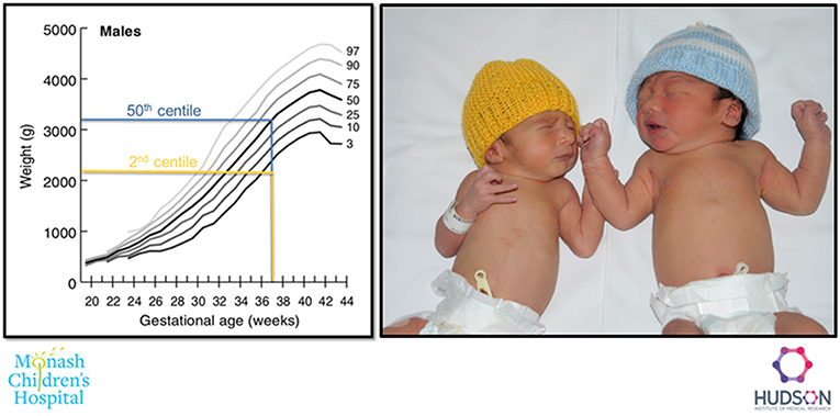 Example of a FGR (2nd centile weight for age, yellow), and an appropriately grown (50th centile weight for age, blue) both infants born at 37 weeks’ gestation, Figure 2 in Neonatal Morbidities of Fetal Growth Restriction: Pathophysiology and Impact by Malhotra, Allison, Castillo-Melendez, Jenkin, Polglase and Miller is licenced CC BY 4.0